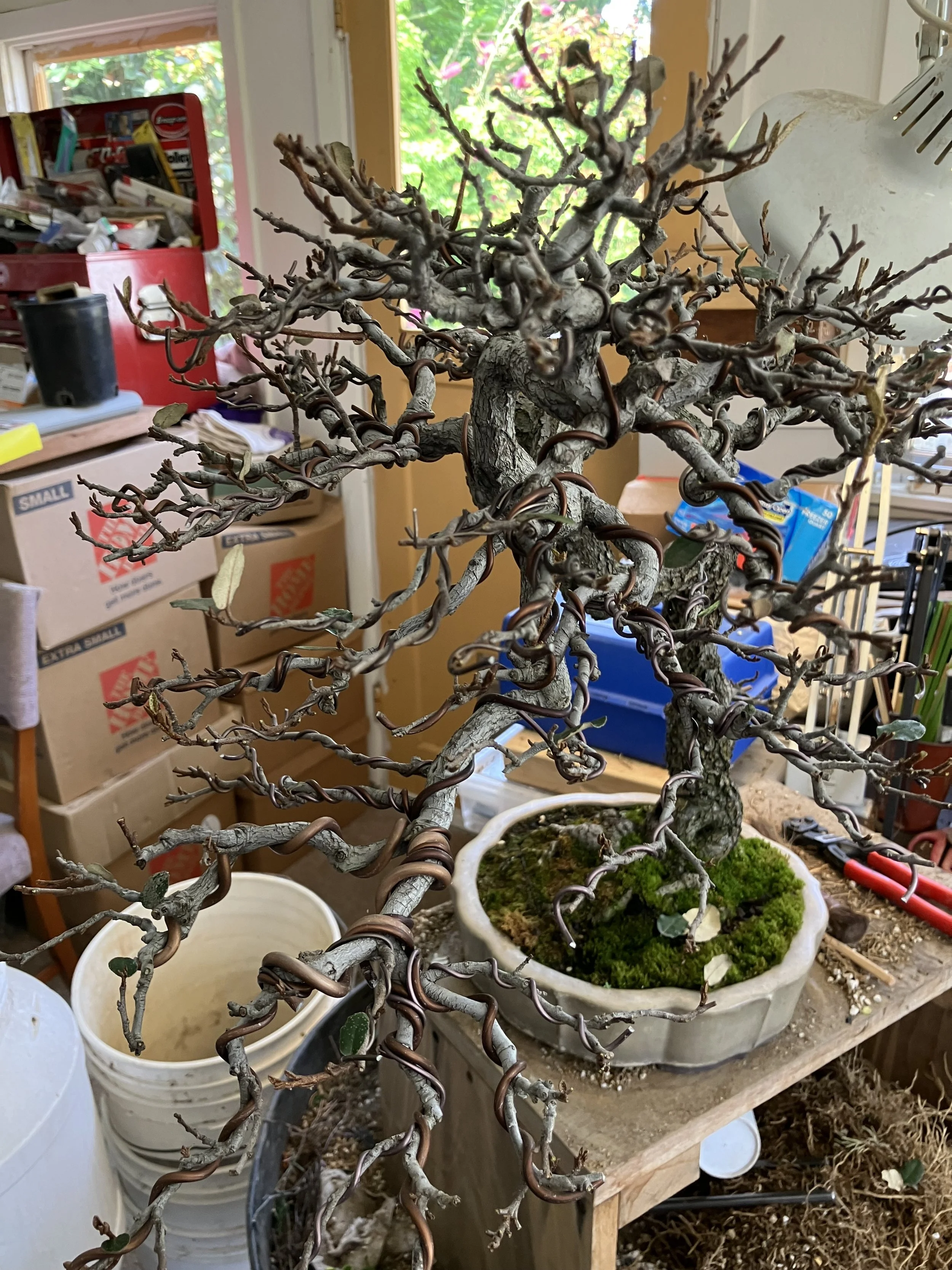 My most recent work was done with Peter Tea. The tree has just been repotted into a beautiful blue container made by Michael Hagedorn, and it continues to develop.