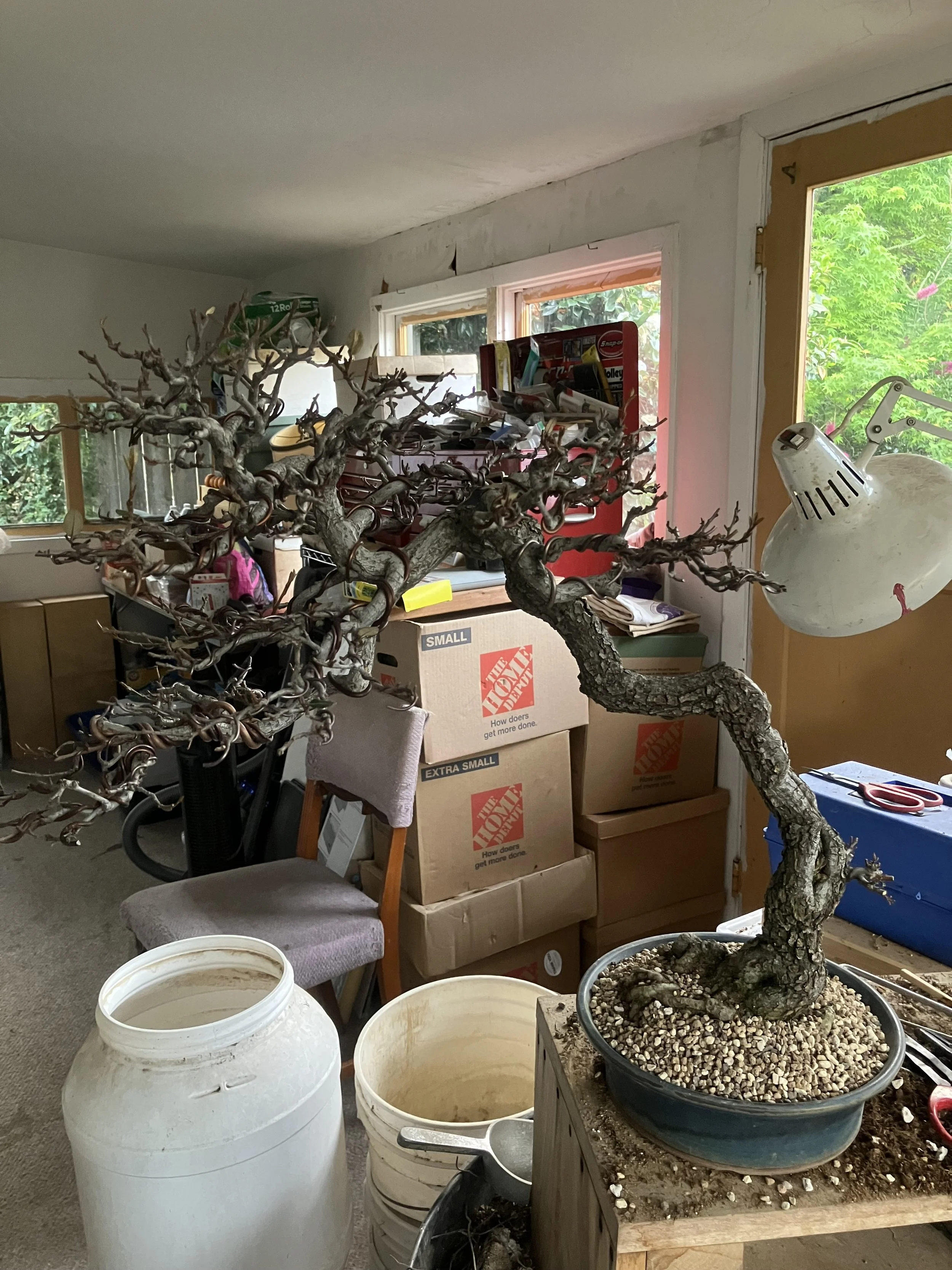 I acquired this tree as material from Gordon Deeg, who obtained it from Sumigawa Nursery in Cotati. I brought it to a workshop with Yasuo Mitsuya and Kathy Shaner, where it began to take shape. This tree is a true traveler — it has made the journey to Hawaii and back to California.