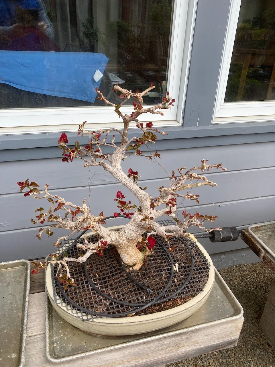 Over time, that vision came to life. Michael carefully selected his two favorite trees to train into bonsai and generously shared the others with fellow club members. This particular variety stands out for its compact branching and the striking way it blooms before leafing out, unlike typical yard Bougainvilleas.