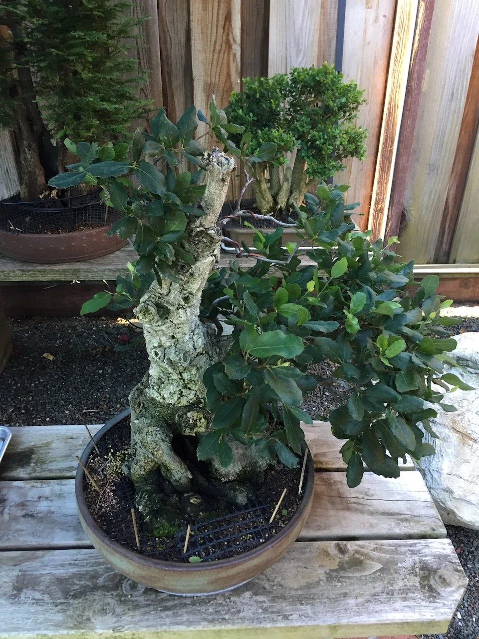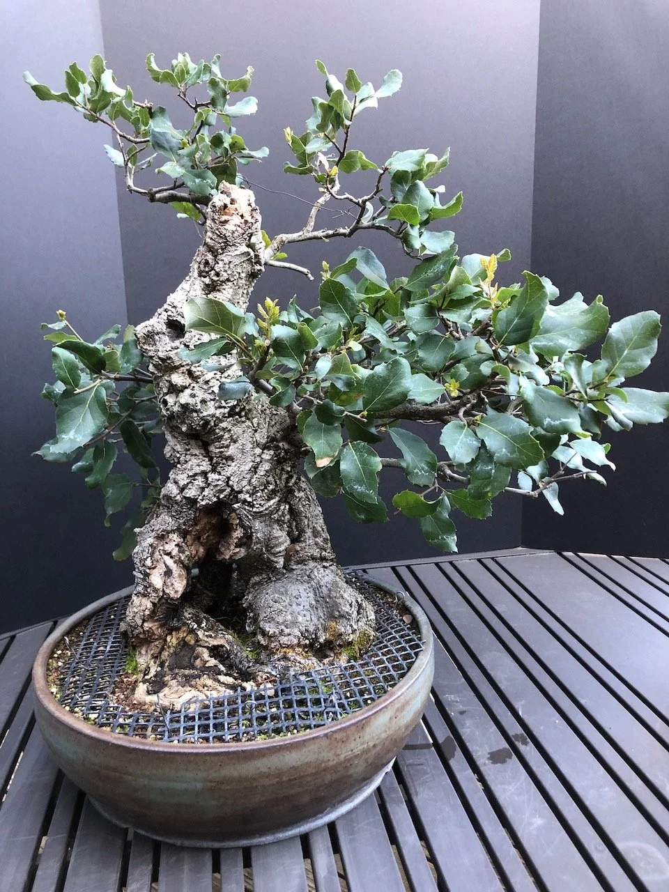 This tree began its life as a tiny 2-year-old seedling, just 5 mm in diameter, gifted to Michael in 1990 by fellow bonsai enthusiast Tosh Saburomaru. Grown from an acorn, the tree’s foliage is larger than typical cork oaks, suggesting it may be a natural hybrid with coast live oak.