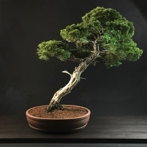 In 1988 I bought this tree from Mr. Ishi — a well-known southern California bonsai man celebrated for his grafting work. At the time it was just four inches tall. The Itoigawa foliage had been grafted onto a San Jose root base, a technique Mr. Ishi was known for.