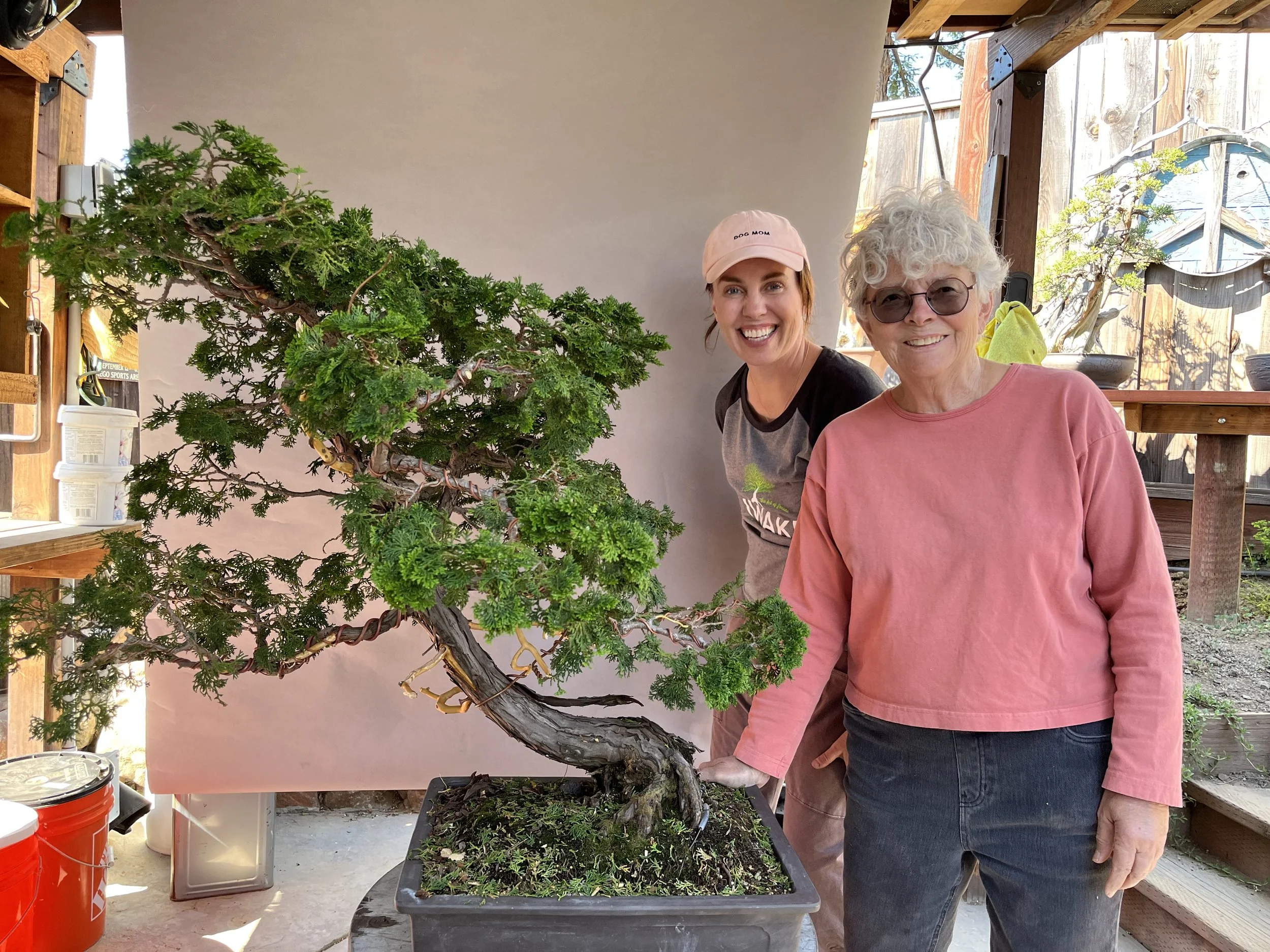 This hinoki has a story within a story. Its original owner, Terence Krista, first encountered bonsai in the early 1990s while living in San Francisco. He found this tree at a small nursery on the western end of Taraval Street — no more than six or seven inches tall. "It loves to be in full sun," Terence recalls, a quality it has carried through the decades.