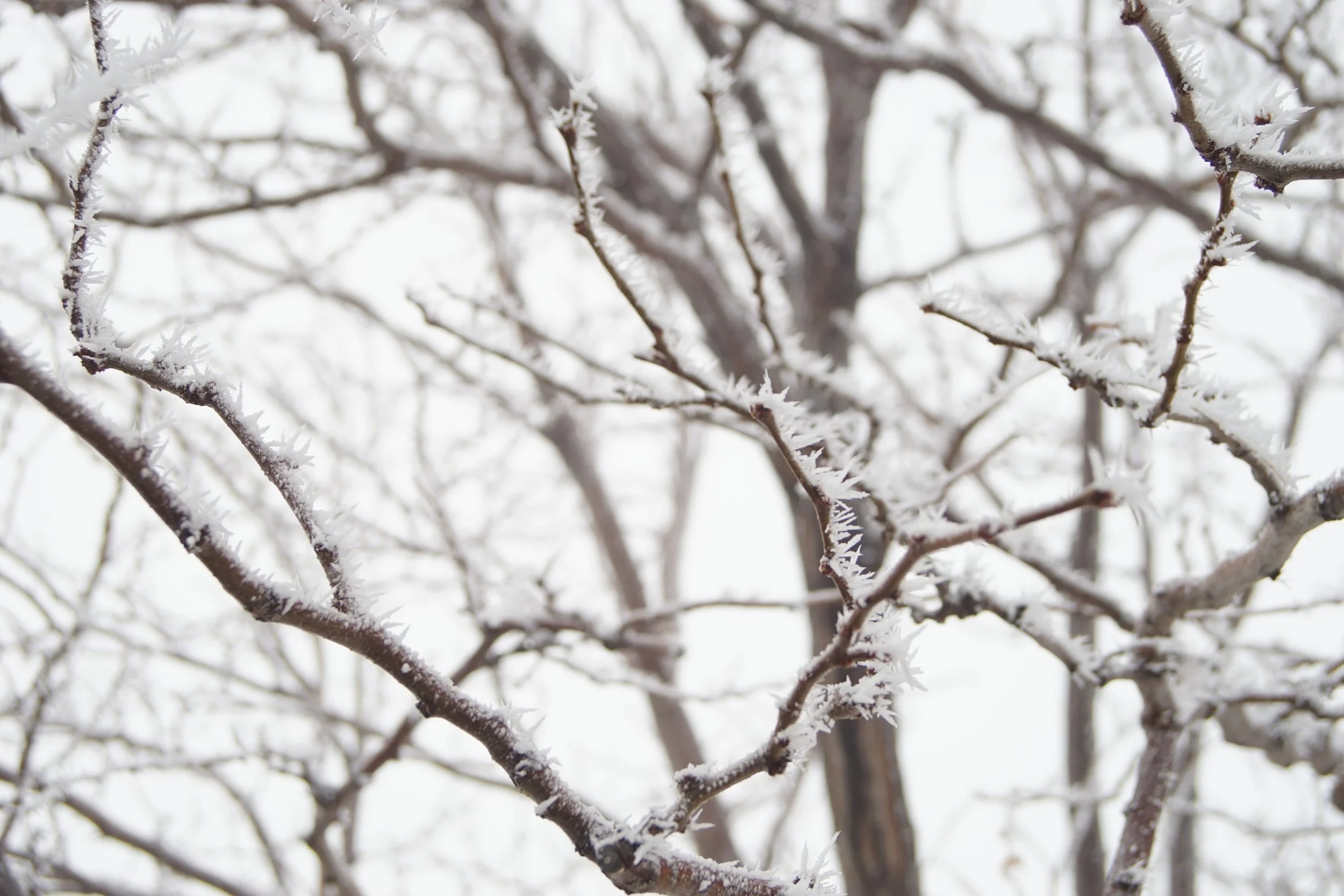 Black twigs etch white winter sky,