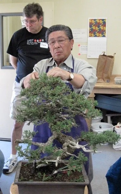 According to John Planting, sometime in the early 1960s Tosh planted a whip in his nursery and bent it around a piece of bamboo to give it shape. At some point John acquired the tree and kept it in a 5-gallon pot until it was used by Tokita (Matsuya's first apprentice) for a demo in 1998. I won the tree and then over the next 20 years did at least one workshop with Mitsuya and Kathy on it in 2004.
