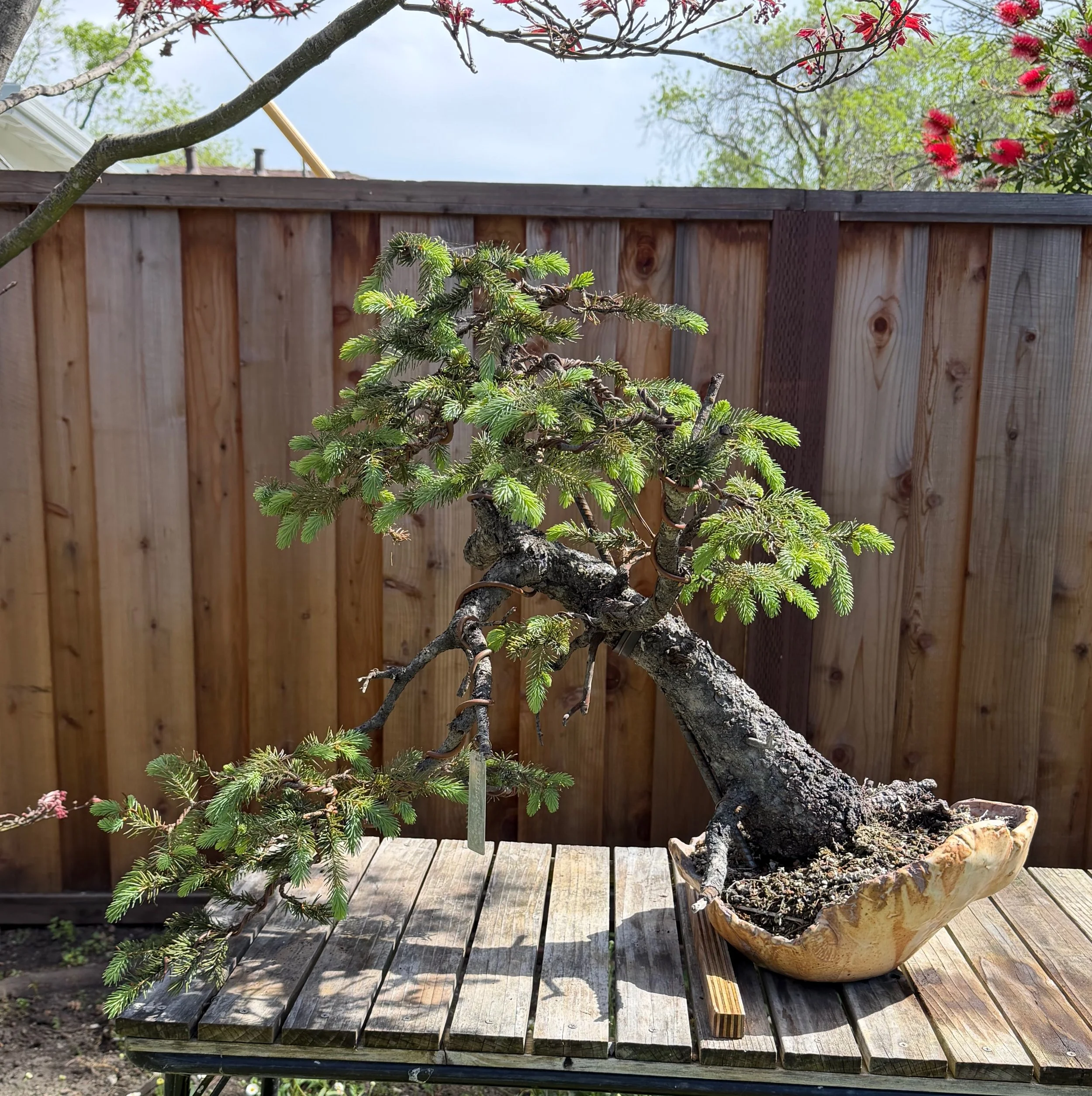 Collected by Randy Knight and purchased in 2023. In 2025, the tree was styled at Bonsai Mirai, Ryan Neil's studio in Portland. It is planted in a pot by Dutch ceramicist Jan Rentenaar. Still very much a tree in development — but one with a strong sense of where it is going.